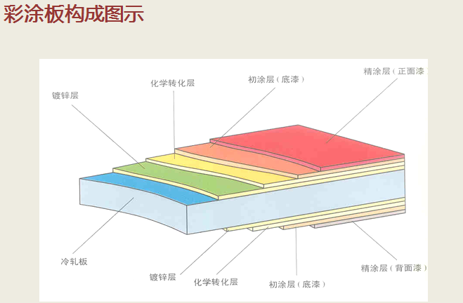 一般彩涂板的涂層分三個概念,底漆、背面漆、正面漆。底漆一般使用環氧樹脂(EP)、聚胺基甲酸乙酯樹脂(PU);背面漆使用環氧樹脂(EP)或聚酯樹脂(PE);正面漆一般使用聚酯樹脂(PE)、有機硅改性聚酯樹脂(SMP)、高耐候聚酯樹脂(HDP)、聚偏二氟乙烯樹脂(PVDF)等。烘烤是進入固化爐處理,一般固化溫度為180℃-250℃,固話時間為15-25分鐘。